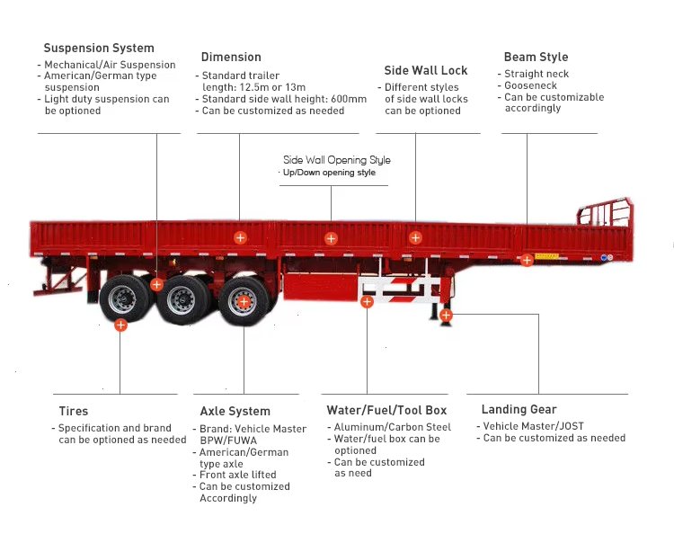 The body is smooth and rounded on the interior to prevent grain entrapment during unloading.Suitable for transporting various types of goods, mainly including: building materials, wood, stone, steel, super long goods, express parcels, accessories, bulk goods such as grain, coal, etc.