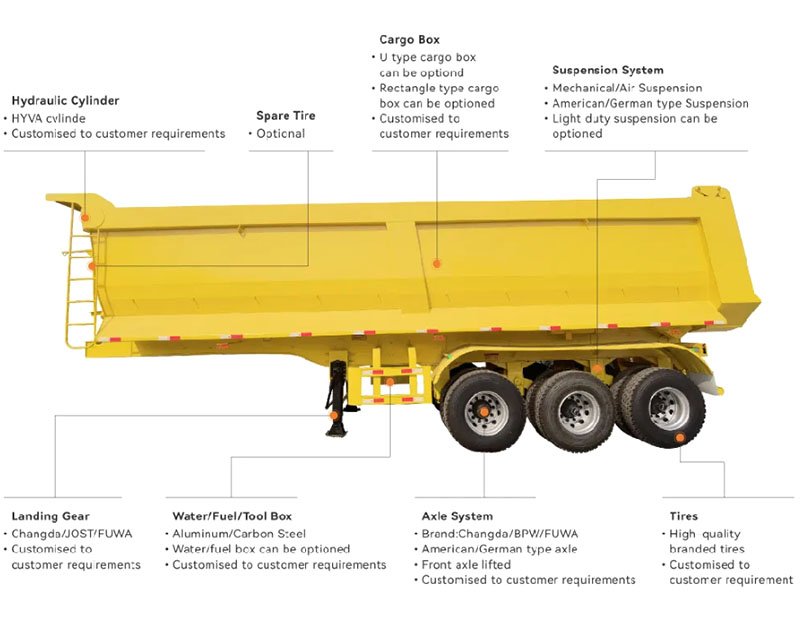 The rear dump trailer is also called a tipper trailer or tipping trailer. They are used to load sand, stone, coal and other solid building materials or industrial raw materials. Rear dump semi-trailers are designed to make unloading easier. After the The back of the trailer is locked, sand can be loaded. When it arrives at the destination, the front side of the semi-trailer can be raised, which makes the goods drop from the back. The bucket of the trailer requires a thicker steel plate , because the goods are often hard materials, and the steel plate can prevent the cargo from damaging the trailer.